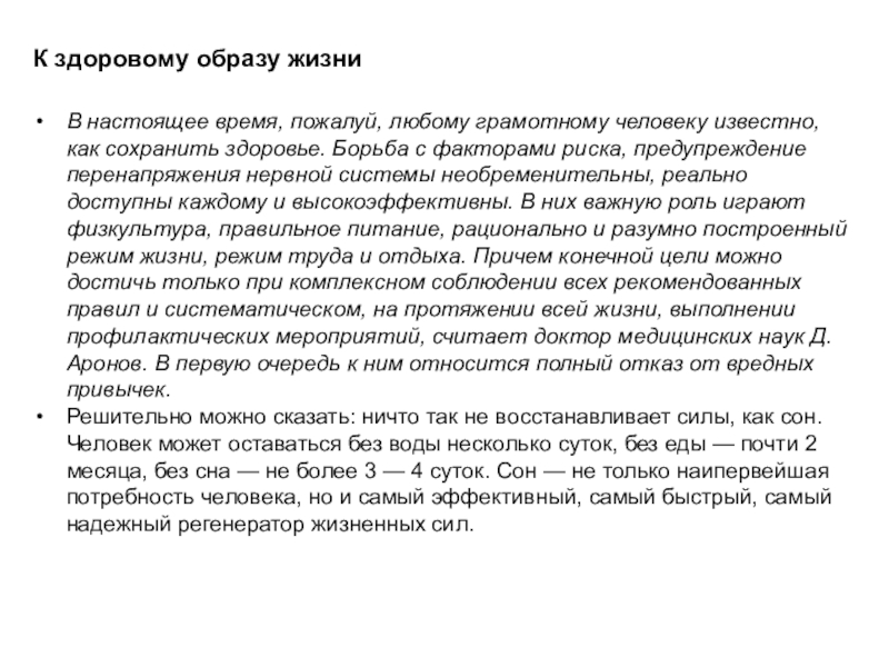 известно, как сохранить здоровье. Борьба с факторами риска, предупреждение перенапряжения нервной системы необременительны, реально доступны каждому и высокоэффективны. В них важную роль играют физкультура, правильное питание, рационально и разумно построенный режим жизни, режим труда и отдыха. Причем конечной цели можно достичь только при комплексном соблюдении всех рекомендованных правил и систематическом, на протяжении всей жизни, выполнении профилактических мероприятий, считает доктор медицинских наук Д. Аронов. В первую очередь к ним относится полный отказ от вредных привычек.