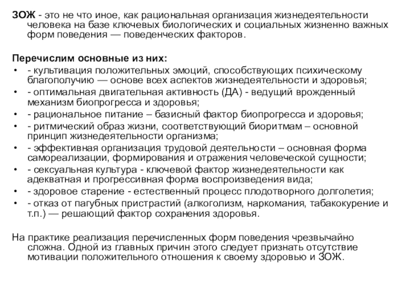 На практике реализация перечисленных форм поведения чрезвычайно сложна. Одной из главных причин этого следует признать отсутствие мотивации положительного отношения к своему здоровью и ЗОЖ.