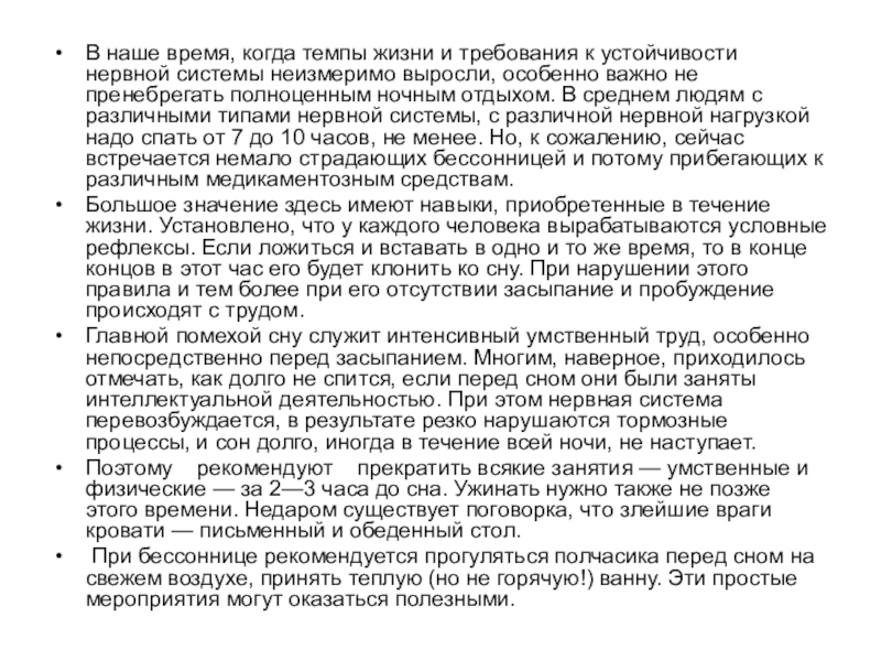 системы неизмеримо выросли, особенно важно не пренебрегать полноценным ночным отдыхом. В среднем людям с различными типами нервной системы, с различной нервной нагрузкой надо спать от 7 до 10 часов, не менее. Но, к сожалению, сейчас встречается немало страдающих бессонницей и потому прибегающих к различным медикаментозным средствам.