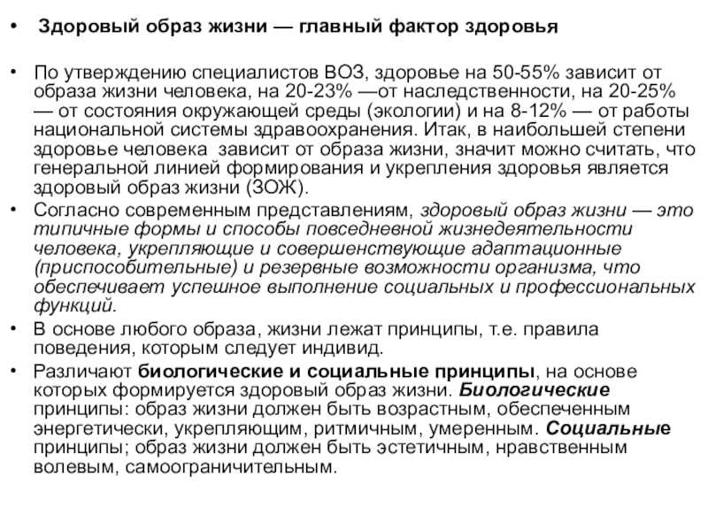 здоровье на 50-55% зависит от образа жизни человека, на 20-23% —от наследственности, на 20-25% — от состояния окружающей среды (экологии) и на 8-12% — от работы национальной системы здравоохранения. Итак, в наибольшей степени здоровье человека зависит от образа жизни, значит можно считать, что генеральной линией формирования и укрепления здоровья является здоровый образ жизни (ЗОЖ).