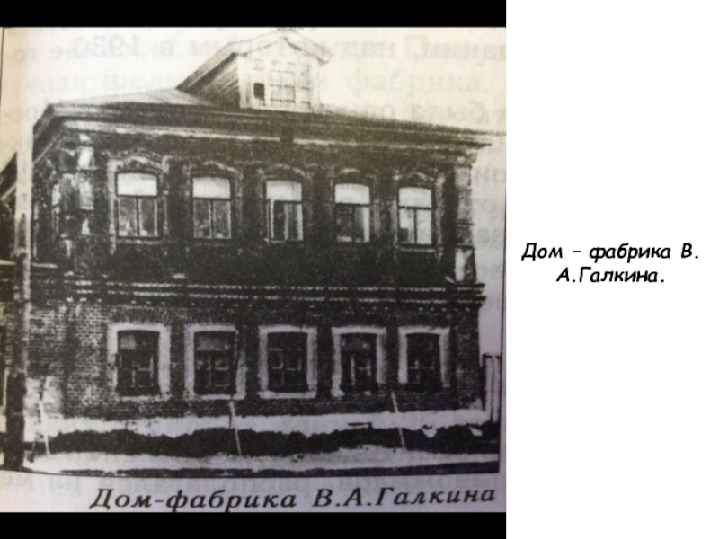 Фабрика Галкиных Это одна из сохранившихся до настоящего времени фабрик Лосино-Петровской слободы. Фабрика входит в состав производственного объединения «Красный шелковщик» с центром в деревне Авдотьино. Время основания – 1860 год, основатель – В.А.Галкин. В