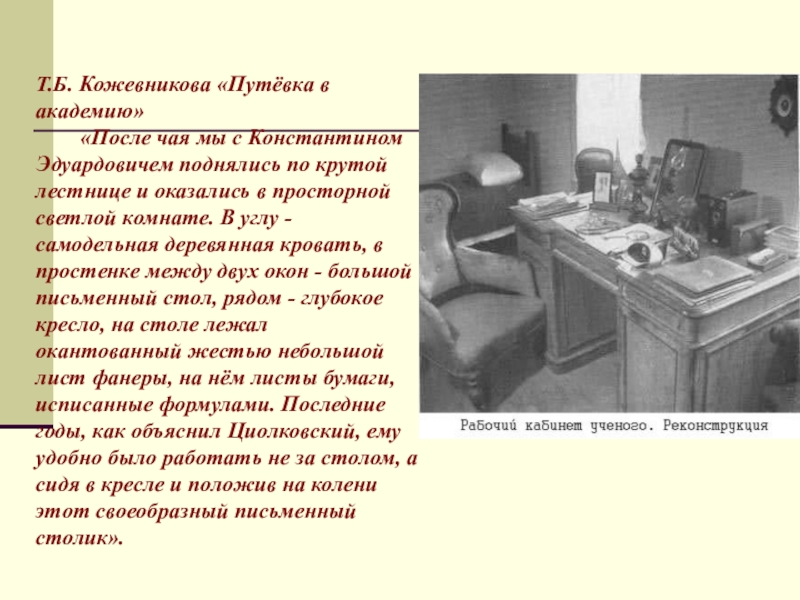 с Константином Эдуардовичем поднялись по крутой лестнице и оказались в просторной светлой комнате. В углу - самодельная деревянная кровать, в простенке между двух окон - большой письменный стол, рядом - глубокое кресло, на столе лежал окантованный жестью небольшой лист фанеры, на нём листы бумаги, исписанные формулами. Последние годы, как объяснил Циолковский, ему удобно было работать не за столом, а сидя в кресле и положив на колени этот своеобразный письменный столик».