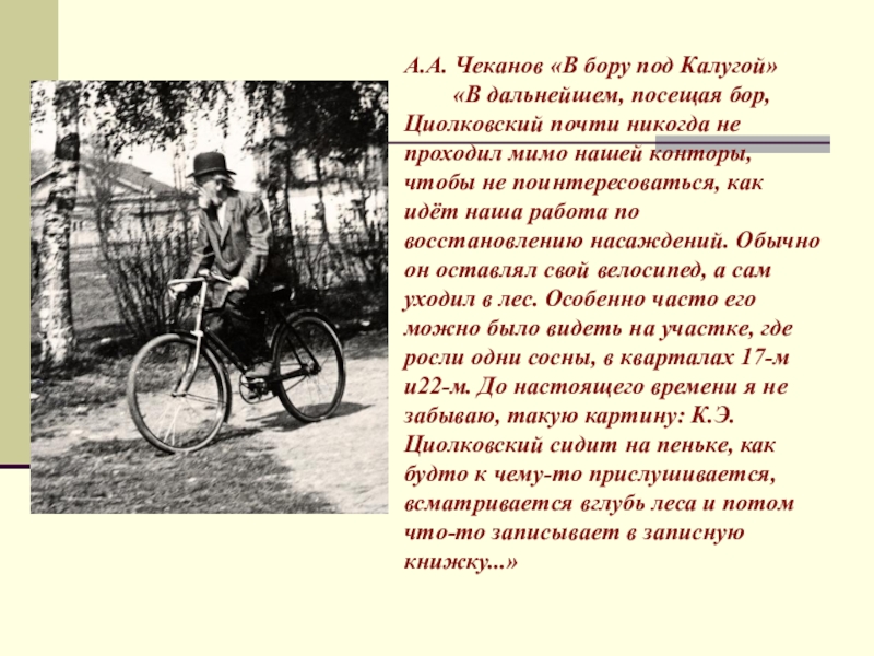 посещая бор, Циолковский почти никогда не проходил мимо нашей конторы, чтобы не поинтересоваться, как идёт наша работа по восстановлению насаждений. Обычно он оставлял свой велосипед, а сам уходил в лес. Особенно часто его можно было видеть на участке, где росли одни сосны, в кварталах 17-м и22-м. До настоящего времени я не забываю, такую картину: К.Э. Циолковский сидит на пеньке, как будто к чему-то прислушивается, всматривается вглубь леса и потом что-то записывает в записную книжку...»