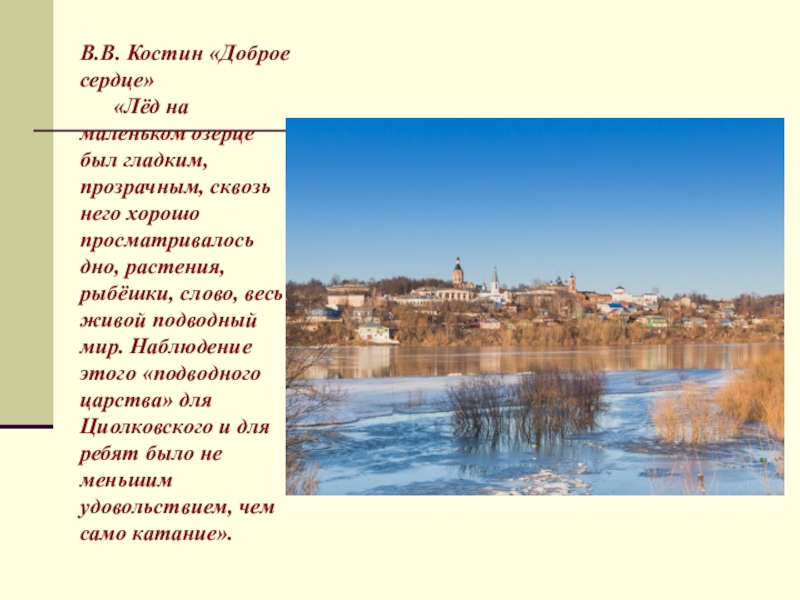гладким, прозрачным, сквозь него хорошо просматривалось дно, растения, рыбёшки, слово, весь живой подводный мир. Наблюдение этого «подводного царства» для Циолковского и для ребят было не меньшим удовольствием, чем само катание».