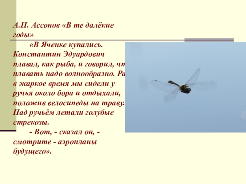 купались. Константин Эдуардович плавал, как рыба, и говорил, что плавать надо волнообразно. Раз в жаркое время мы сидели у ручья около бора и отдыхали, положив велосипеды на траву. Над ручьём летали голубые стрекозы.