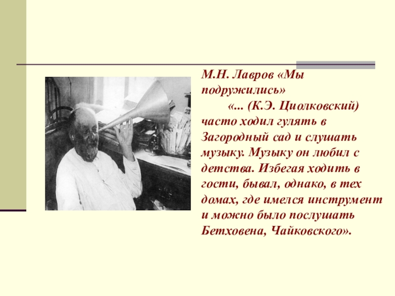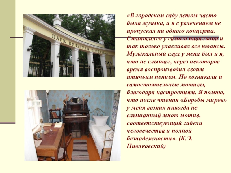 не пропускал ни одного концерта. Становился у самого павильона и так только улавливал все нюансы. Музыкальный слух у меня был и я, что не слышал, через некоторое время воспроизводил своим птичьим пением. Но возникали и самостоятельные мотивы, благодаря настроениям. Я помню, что после чтения «Борьбы миров» у меня возник никогда не слышанный мною мотив, соответствующий гибели человечества и полной безнадежности». (К.Э. Циолковский)