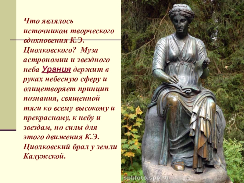 неба Урания держит в руках небесную сферу и олицетворяет принцип познания, священной тяги ко всему высокому и прекрасному, к небу и звездам, но силы для этого движения К.Э. Циолковский брал у земли Калужской.