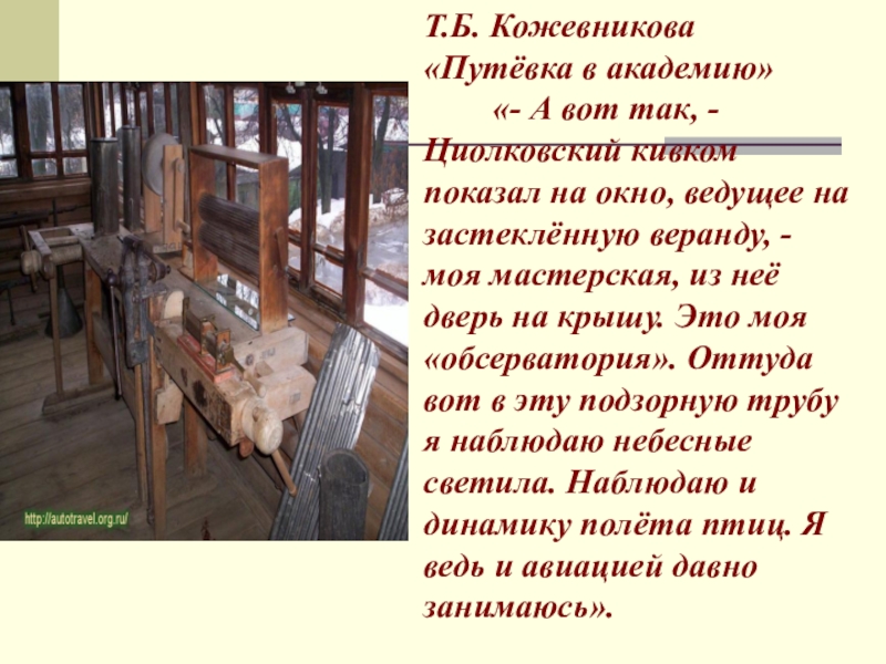 так, - Циолковский кивком показал на окно, ведущее на застеклённую веранду, - моя мастерская, из неё дверь на крышу. Это моя «обсерватория». Оттуда вот в эту подзорную трубу я наблюдаю небесные светила. Наблюдаю и динамику полёта птиц. Я ведь и авиацией давно занимаюсь».