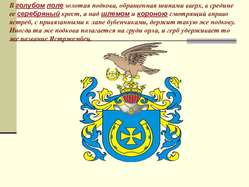 смотрящий вправо ястреб, с привязанными к лапе бубенчиками, держит такую же подкову. Иногда та же подкова полагается на груди орла, и герб удерживает то же название Ястржембец.