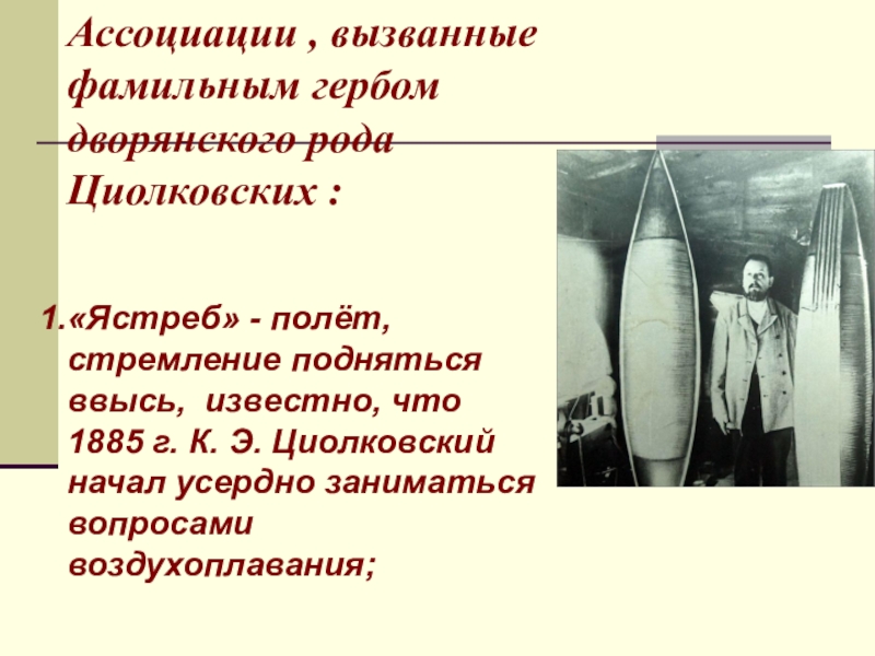 Слайд 2Ассоциации , вызванные фамильным гербом дворянского рода Циолковских :
