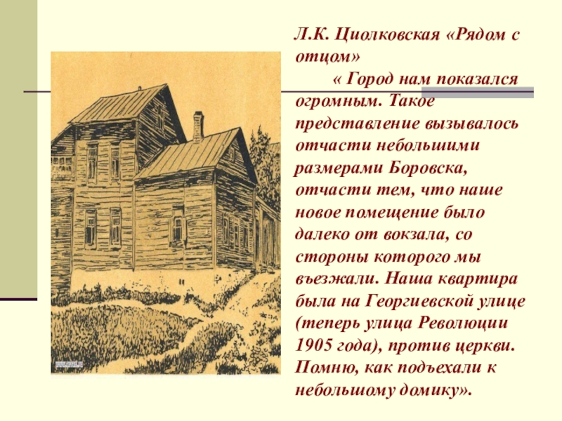 показался огромным. Такое представление вызывалось отчасти небольшими размерами Боровска, отчасти тем, что наше новое помещение было далеко от вокзала, со стороны которого мы въезжали. Наша квартира была на Георгиевской улице (теперь улица Революции 1905 года), против церкви. Помню, как подъехали к небольшому домику».
