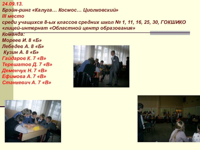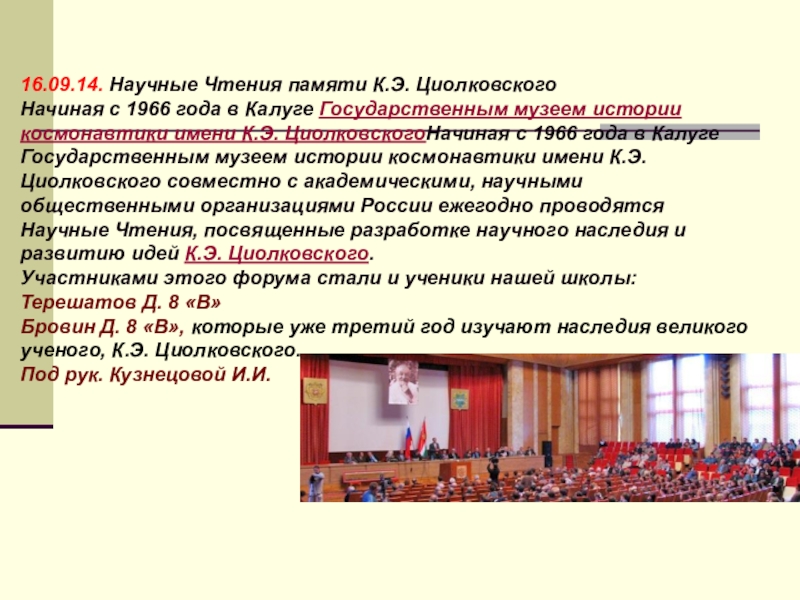 Бровин Д. 8 «В», которые уже третий год изучают наследия великого ученого, К.Э. Циолковского.