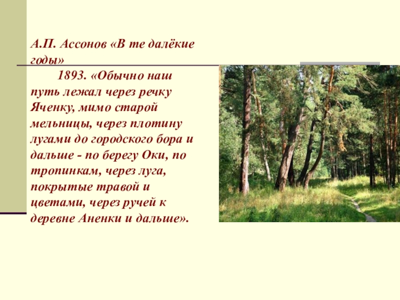 наш путь лежал через речку Яченку, мимо старой мельницы, через плотину лугами до городского бора и дальше - по берегу Оки, по тропинкам, через луга, покрытые травой и цветами, через ручей к деревне Аненки и дальше».