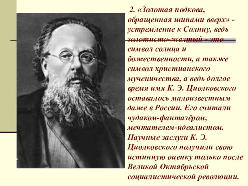 ведь золотисто-желтый - это символ солнца и божественности, а также символ христианского мученичества, а ведь долгое время имя К. Э. Циолковского оставалось малоизвестным даже в России. Его считали чудаком-фантазёром, мечтателем-идеалистом. Научные заслуги К. Э. Циолковского получили свою истинную оценку только после Великой Октябрьской социалистической революции.