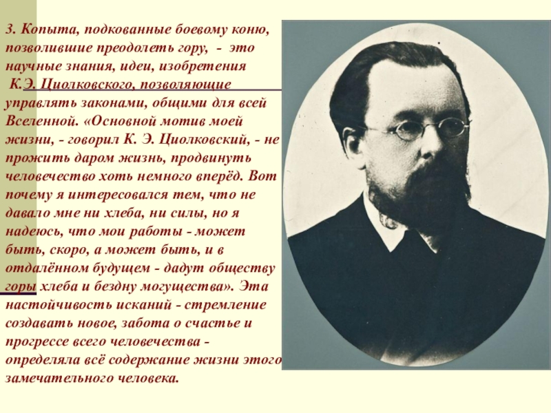 К.Э. Циолковского, позволяющие управлять законами, общими для всей Вселенной. «Основной мотив моей жизни, - говорил К. Э. Циолковский, - не прожить даром жизнь, продвинуть человечество хоть немного вперёд. Вот почему я интересовался тем, что не давало мне ни хлеба, ни силы, но я надеюсь, что мои работы - может быть, скоро, а может быть, и в отдалённом будущем - дадут обществу горы хлеба и бездну могущества». Эта настойчивость исканий - стремление создавать новое, забота о счастье и прогрессе всего человечества - определяла всё содержание жизни этого замечательного человека.