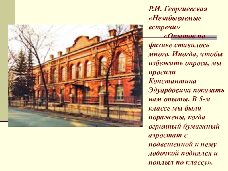 много. Иногда, чтобы избежать опроса, мы просили Константина Эдуардовича показать нам опыты. В 5-м классе мы были поражены, когда огромный бумажный аэростат с подвешенной к нему лодочкой поднялся и поплыл по классу».