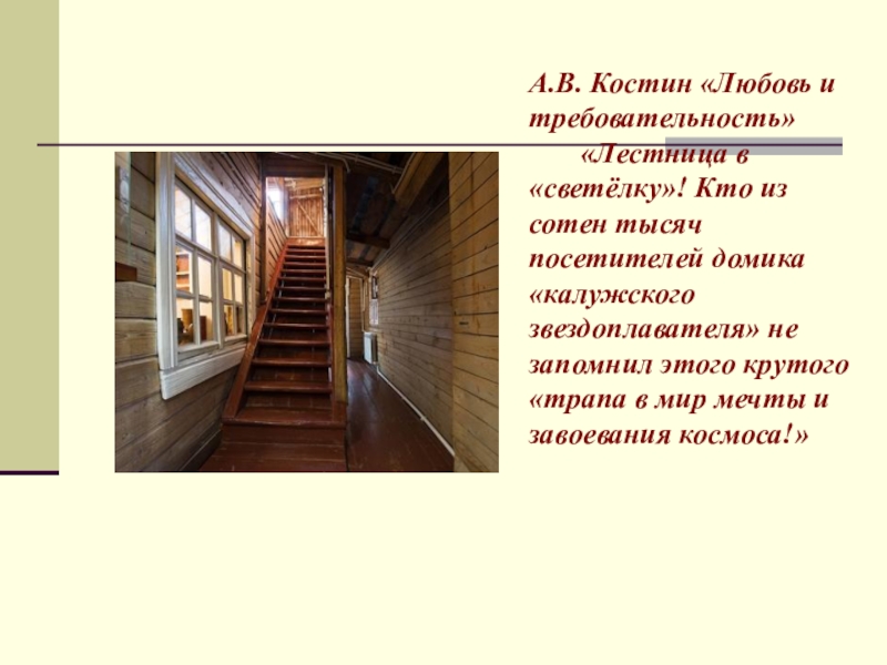 Кто из сотен тысяч посетителей домика «калужского звездоплавателя» не запомнил этого крутого «трапа в мир мечты и завоевания космоса!»