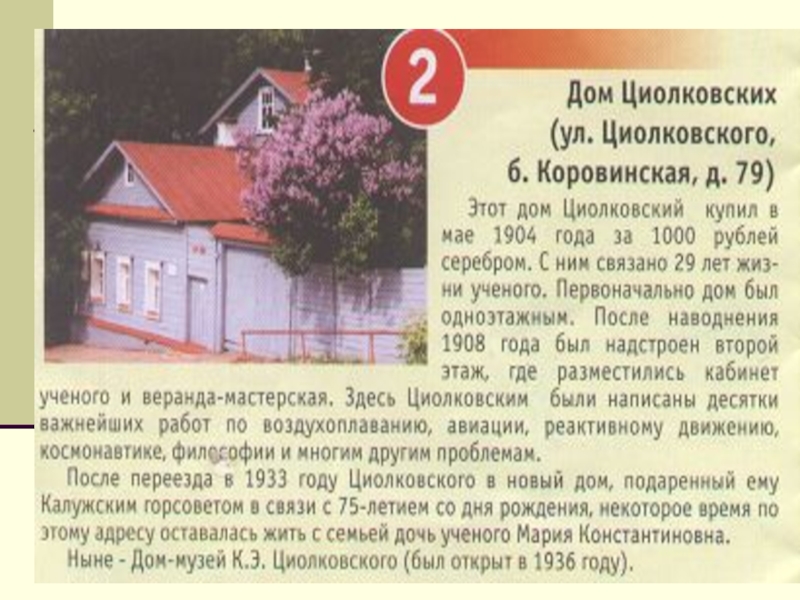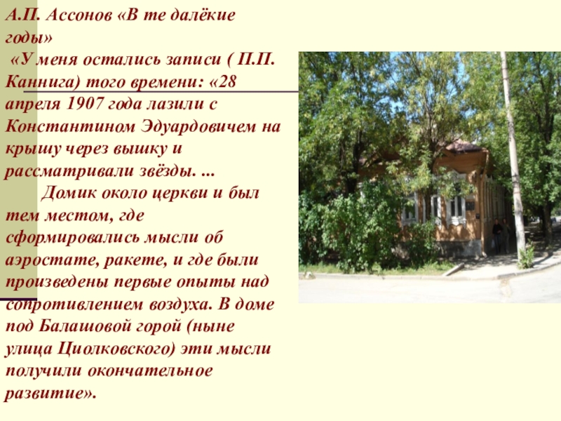 Домик около церкви и был тем местом, где сформировались мысли об аэростате, ракете, и где были произведены первые опыты над сопротивлением воздуха. В доме под Балашовой горой (ныне улица Циолковского) эти мысли получили окончательное развитие».