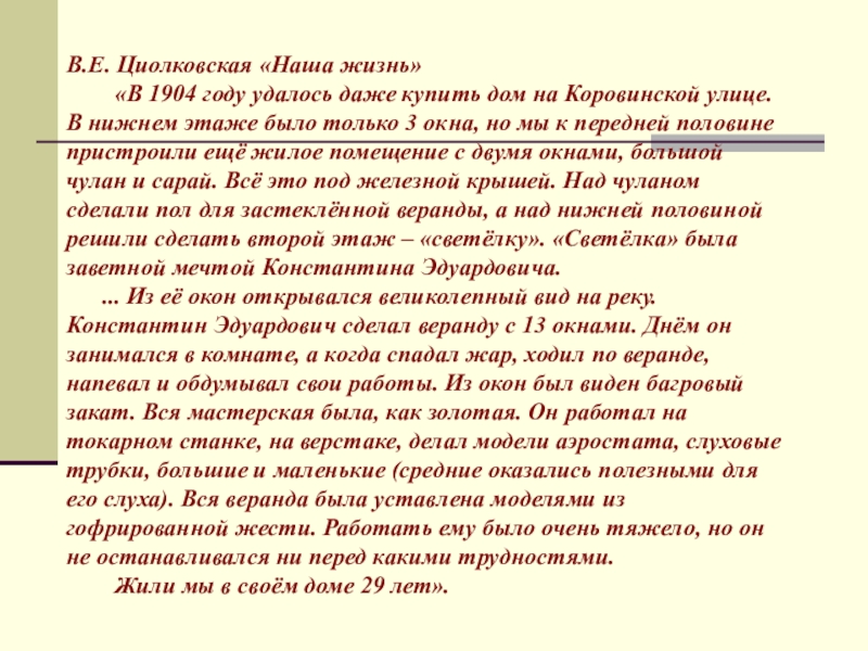 ... Из её окон открывался великолепный вид на реку. Константин Эдуардович сделал веранду с 13 окнами. Днём он занимался в комнате, а когда спадал жар, ходил по веранде, напевал и обдумывал свои работы. Из окон был виден багровый закат. Вся мастерская была, как золотая. Он работал на токарном станке, на верстаке, делал модели аэростата, слуховые трубки, большие и маленькие (средние оказались полезными для его слуха). Вся веранда была уставлена моделями из гофрированной жести. Работать ему было очень тяжело, но он не останавливался ни перед какими трудностями.