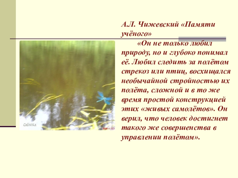 природу, но и глубоко понимал её. Любил следить за полётом стрекоз или птиц, восхищался необычайной стройностью их полёта, сложной и в то же время простой конструкцией этих «живых самолётов». Он верил, что человек достигнет такого же совершенства в управлении полётом».