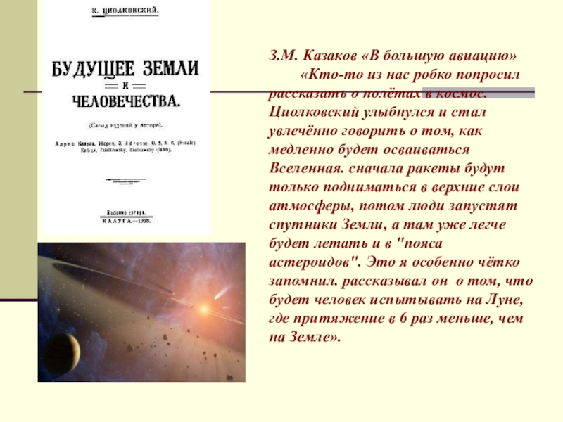 робко попросил рассказать о полётах в космос. Циолковский улыбнулся и стал увлечённо говорить о том, как медленно будет осваиваться Вселенная. сначала ракеты будут только подниматься в верхние слои атмосферы, потом люди запустят спутники Земли, а там уже легче будет летать и в "пояса астероидов". Это я особенно чётко запомнил. рассказывал он о том, что будет человек испытывать на Луне, где притяжение в 6 раз меньше, чем на Земле».