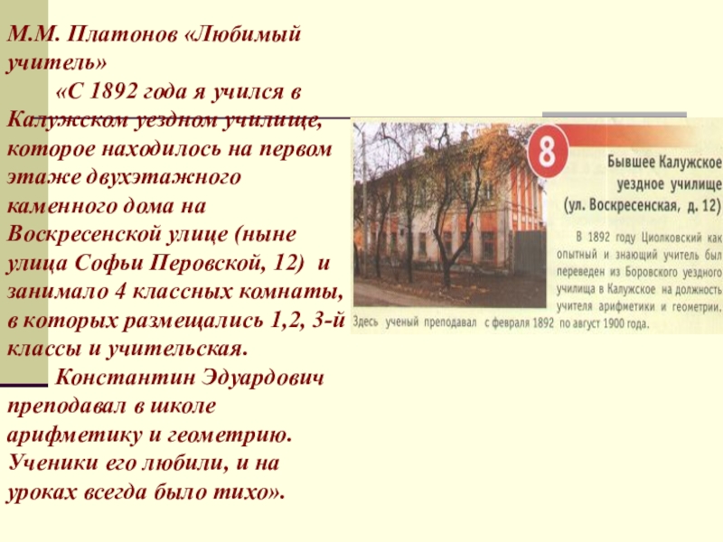 Константин Эдуардович преподавал в школе арифметику и геометрию. Ученики его любили, и на уроках всегда было тихо».