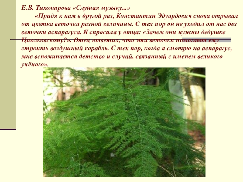 другой раз, Константин Эдуардович снова отрывал от цветка веточки разной величины. С тех пор он не уходил от нас без веточки аспарагуса. Я спросила у отца: «Зачем они нужны дедушке Циолковскому?». Отец ответил, что эти веточки помогают ему строить воздушный корабль. С тех пор, когда я смотрю на аспарагус, мне вспоминается детство и случай, связанный с именем великого учёного».