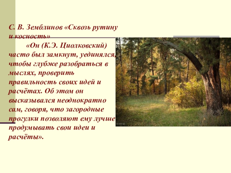 «Он (К.Э. Циолковский) часто был замкнут, уединялся, чтобы глубже разобраться в мыслях, проверить правильность своих идей и расчётах. Об этом он высказывался неоднократно сам, говоря, что загородные прогулки позволяют ему лучше продумывать свои идеи и расчёты».