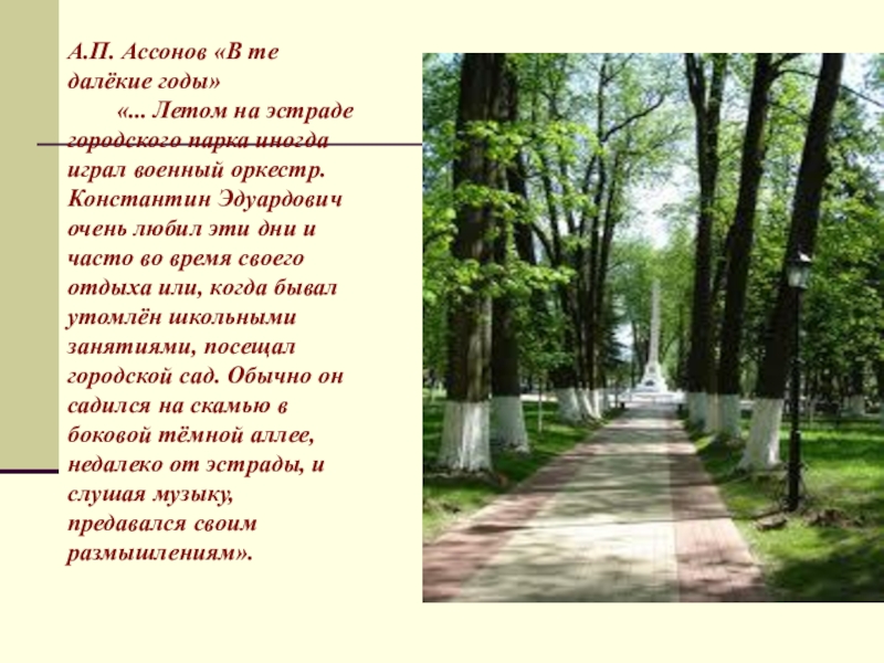 на эстраде городского парка иногда играл военный оркестр. Константин Эдуардович очень любил эти дни и часто во время своего отдыха или, когда бывал утомлён школьными занятиями, посещал городской сад. Обычно он садился на скамью в боковой тёмной аллее, недалеко от эстрады, и слушая музыку, предавался своим размышлениям».