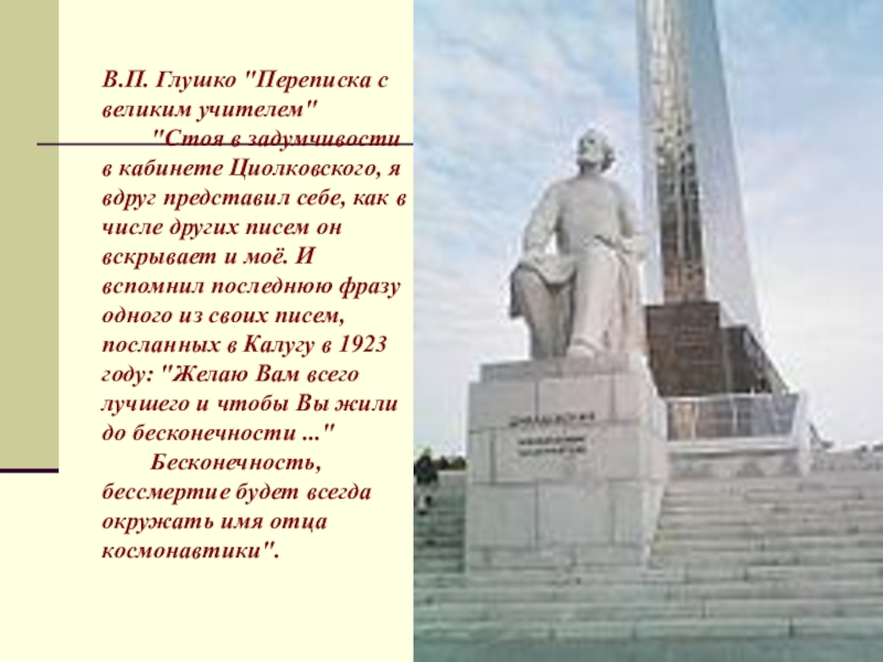 Бесконечность, бессмертие будет всегда окружать имя отца космонавтики".