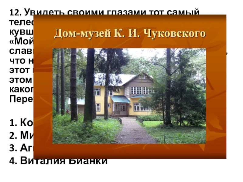 или кувшин, мелькавший на страницах «Мойдодыра». Заглянуть в уютный и славный мир автора «Тараканища». Понять, что не единой «Мухой-Цокотухой» славен этот гениальный человек можно только в этом самом доме в Переделкино. Музей какого детского писателя находиться в Переделкино?