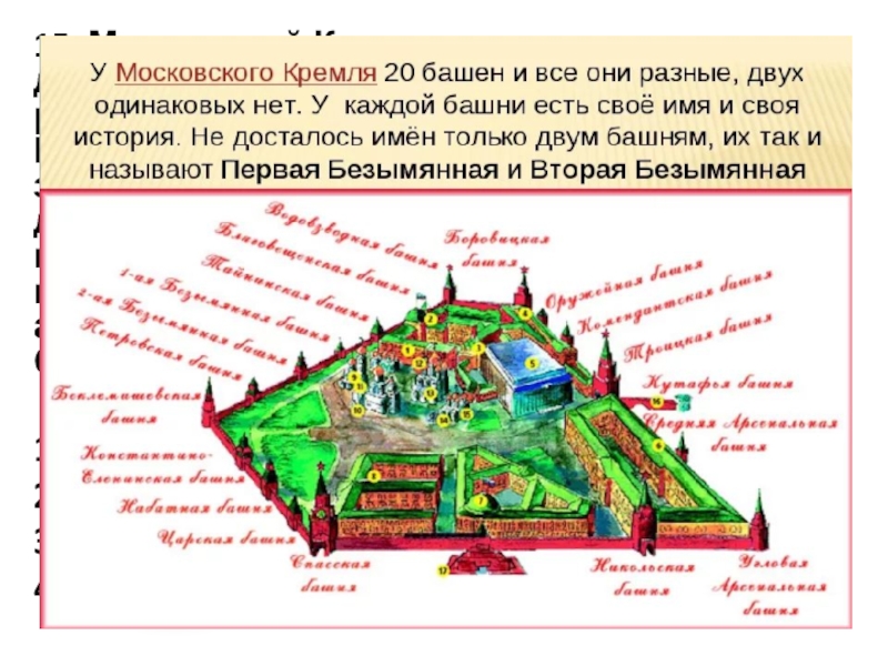 центре столицы России. Его мощные стены и башни, златоверхие храмы, древние терема и дворцы возвышаются на Боровицком холме над Москвой-рекой и образуют неповторимый по красоте и величию архитектурно-художественный ансамбль. Сколько башен имеет Московский Кремль?
