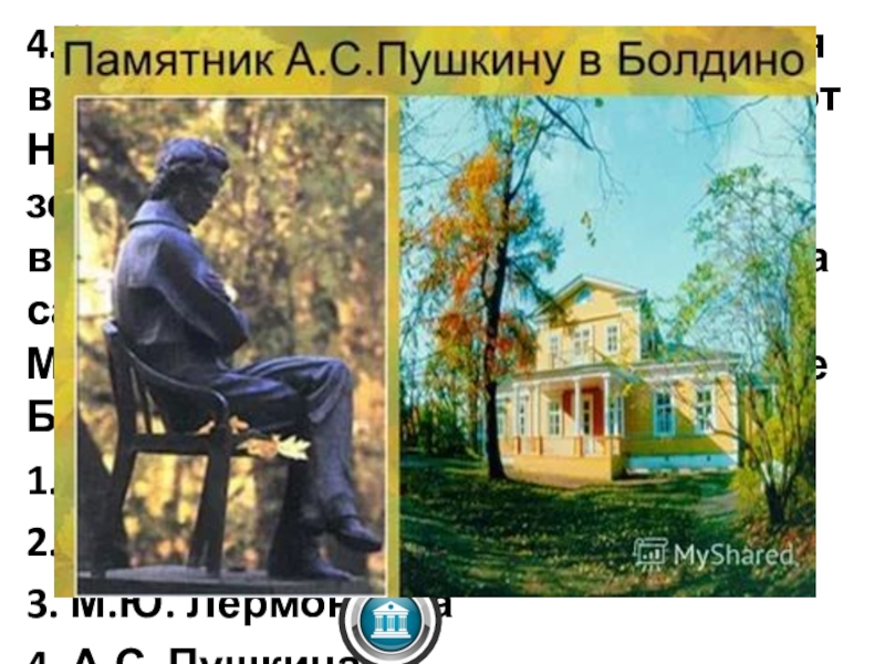 Нижнего Новгорода. Болдино и земли, окружающие его, около трёх веков находились во владении рода самого известного русского поэта. Музей какого поэта находится в селе Болдино?