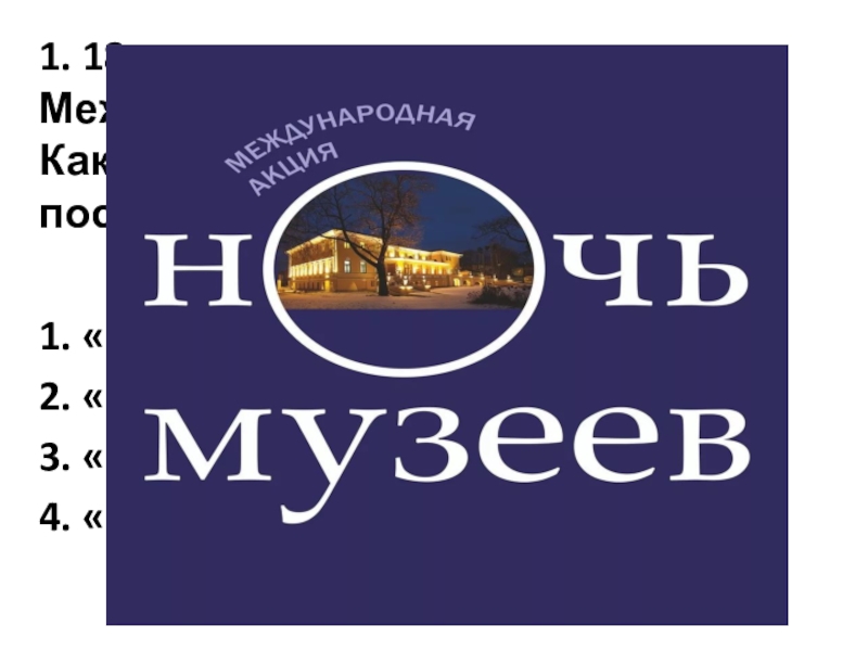 Слайд 41. 18 мая празднуют Международный день музеев. Какая международная акция посвящена