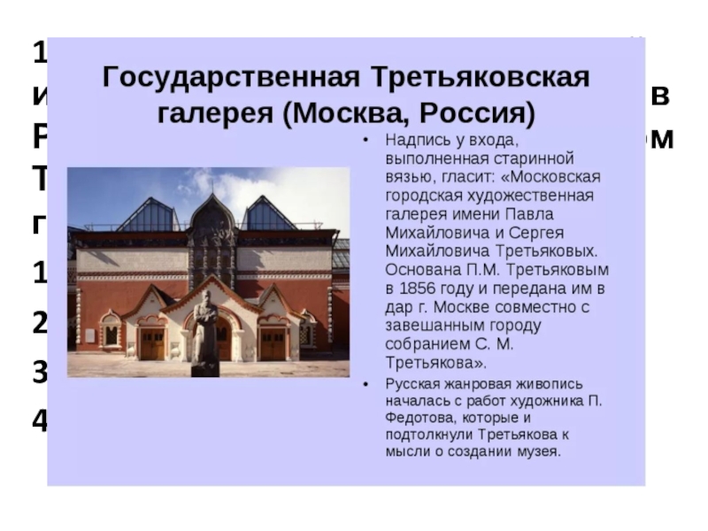 Слайд 1411.Третьяковская галерея — самый известный художественный музей в России, основанный купцом