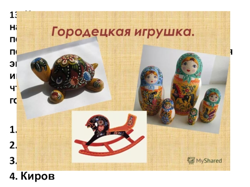 растёт. Это самая большая подборка дымковских игрушек. Постоянная экспозиция вмещает только около 250 игрушек, но и этого достаточно для того, чтобы получить море удовольствия. Какой город прославила дымковская игрушка?