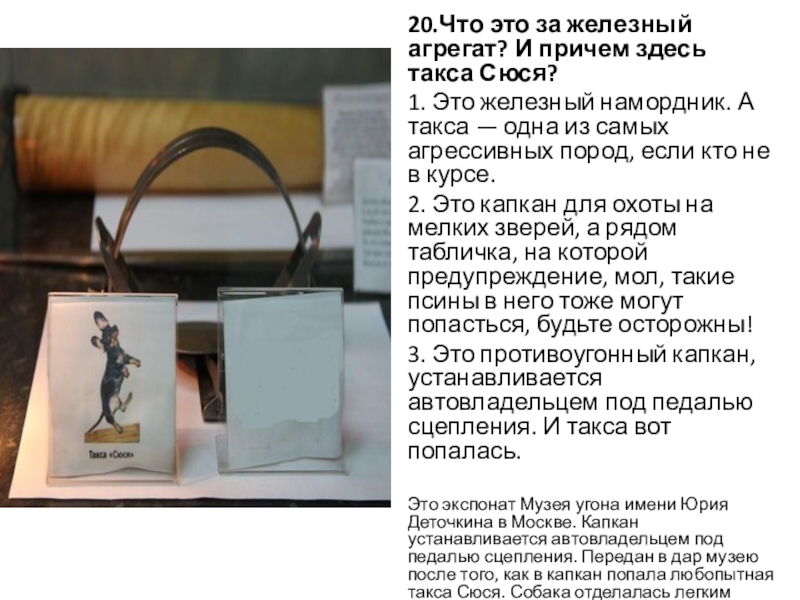 Слайд 2320.Что это за железный агрегат? И причем здесь такса Сюся?