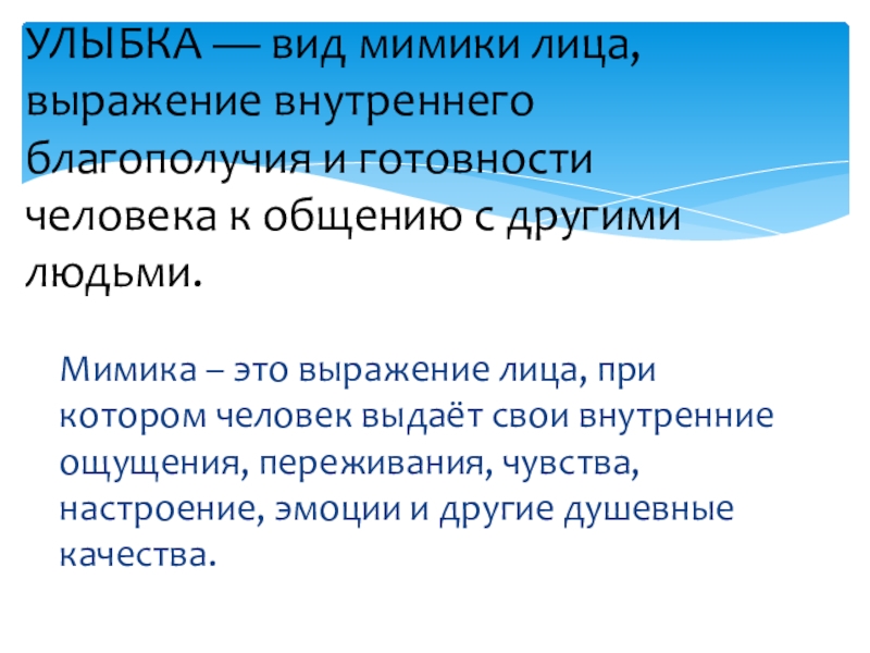 УЛЫБКА — вид мимики лица, выражение внутреннего благополучия и готовности человека к общению с другими людьми.