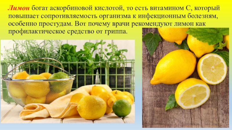 Слайд 12Лимон богат аскорбиновой кислотой, то есть витамином С, который повышает сопротивляемость