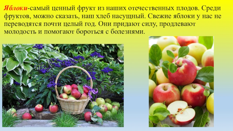 Слайд 10Яблоки-самый ценный фрукт из наших отечественных плодов. Среди фруктов, можно сказать,