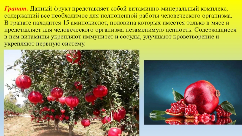 Слайд 21Гранат. Данный фрукт представляет собой витаминно-минеральный комплекс, содержащий все необходимое для