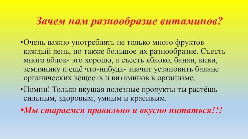 Слайд 7 Зачем нам разнообразие витаминов?