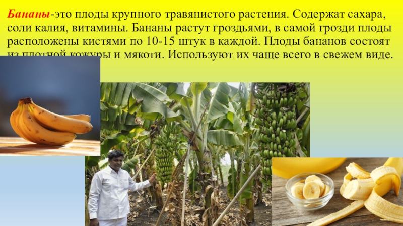 Слайд 19Бананы-это плоды крупного травянистого растения. Содержат сахара, соли калия, витамины. Бананы