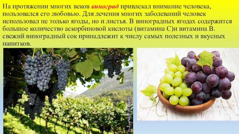 Слайд 14На протяжении многих веков виноград привлекал внимание человека, пользовался его любовью.