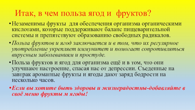 Слайд 23Итак, в чем польза ягод и фруктов?