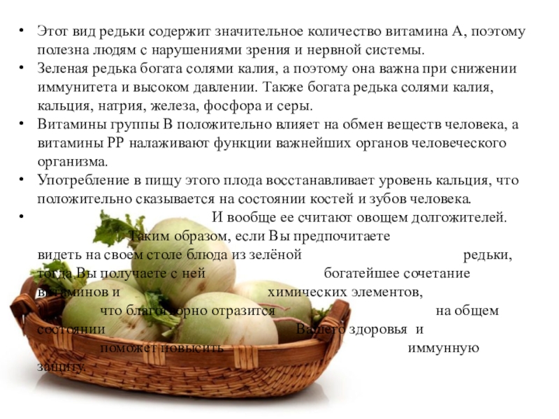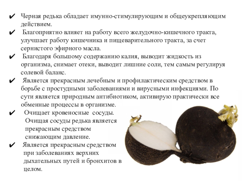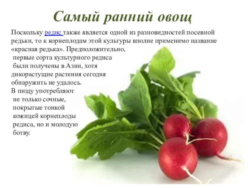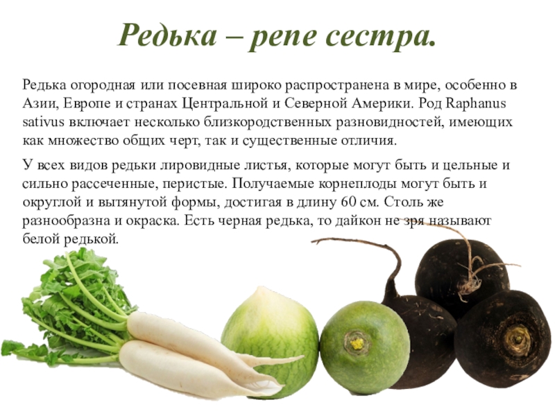 У всех видов редьки лировидные листья, которые могут быть и цельные и сильно рассеченные, перистые. Получаемые корнеплоды могут быть и округлой и вытянутой формы, достигая в длину 60 см. Столь же разнообразна и окраска. Есть черная редька, то дайкон не зря называют белой редькой.
