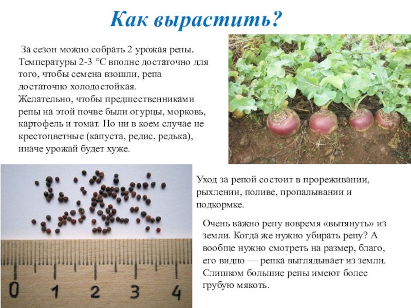 Уход за репой состоит в прореживании, рыхлении, поливе, пропалывании и подкормке.