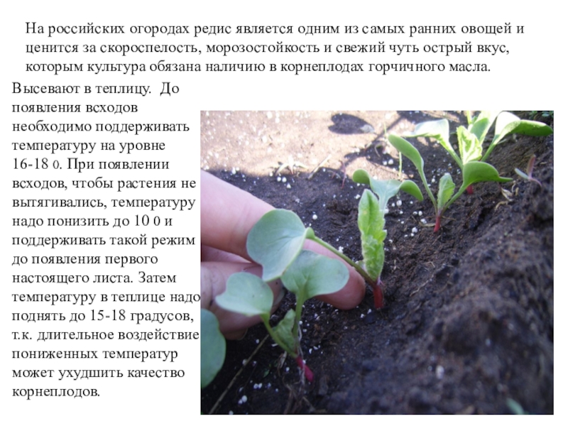 Высевают в теплицу. До появления всходов необходимо поддерживать температуру на уровне 16-18 0. При появлении всходов, чтобы растения не вытягивались, температуру надо понизить до 10 0 и поддерживать такой режим до появления первого настоящего листа. Затем температуру в теплице надо поднять до 15-18 градусов, т.к. длительное воздействие пониженных температур может ухудшить качество корнеплодов.
