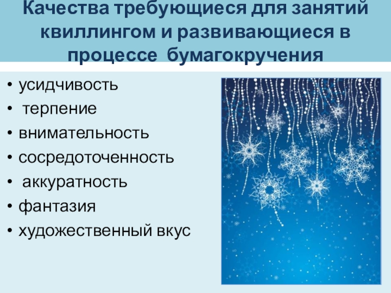 Слайд 5Качества требующиеся для занятий квиллингом и развивающиеся в процессе бумагокручения