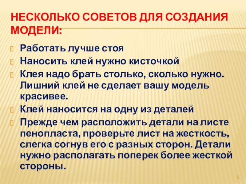 Несколько советов для создания модели:Работать лучше стояНаносить клей нужно кисточкойКлея надо брать столько, сколько нужно. Лишний клей